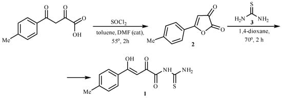The title compound 1 was synthesized in several stages (Scheme 2). Initially, 5-(p-tolyl)furan-2,3-dione 2 was obtained in the reaction of 2,4-dioxo-4-(p-tolyl)butanoic acid with thionyl chloride [9]. Then, as a result of the reaction of compound 2 and thiourea 3, (Z)-N-carbamothioyl-4-hydroxy-2-oxo-4-(p-tolyl)but-3-enamide 1, the target compound, was obtained for the first time.