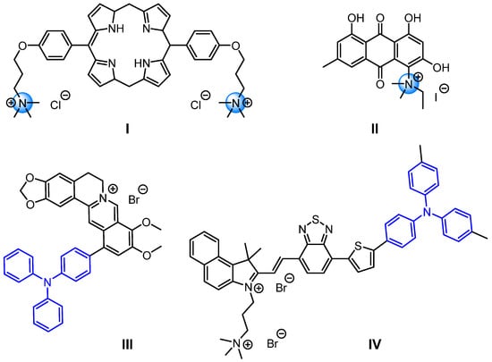 Triphenylamine (TPA) is an important organic compound whose molecular structure consists of three benzene rings connected to a central nitrogen atom, forming a “propeller” or “shamrock”-like configuration. While TPA itself does not exhibit significant antibacterial activity, the lone pair of electrons on its nitrogen atom can delocalize into the benzene rings [8]. This excellent characteristic makes it a strong electron donor, thus serving as an ideal pharmacophore or structural scaffold for antimicrobial drug development (Figure 1III,IV) [9,10]. Additionally, TPA can act as a photosensitizer. Upon exposure to light of a specific wavelength, it absorbs photon energy and transitions from the ground state to an excited state. The excited TPA then transfers energy to surrounding molecular oxygen, generating highly reactive oxygen species (ROS) such as singlet oxygen (1O2) [11]. ROS irreversibly oxidizes and damages bacterial cell membranes, proteins, lipids, and DNA, leading to bacterial death. Moreover, since ROS attacks multiple cellular targets simultaneously, bacteria struggle to develop resistance through single mutations [12].