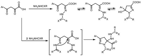 Synthesis of pyrazolines by reaction of aroylpyruvic acids and substituted hydrazines in various proportions.