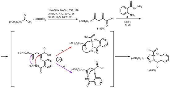 The title compound 1 was synthesized in several steps (Scheme 2). Initially, 2,4-dioxo-4-(p-tolyl)butanoic acid 3 was obtained by the Claisen condensation of 1-(p-tolyl)ethan-1-one and diethyl oxalate. Then, as a result of the reaction of compound 3 and 2-aminobenzohydrazide 2, 9-oxo-2-(p-tolyl)-4,9-dihydropyrazolo[5,1-b]quinazoline-3a(3H)-carboxylic acid 1, the target compound, was obtained for the first time.