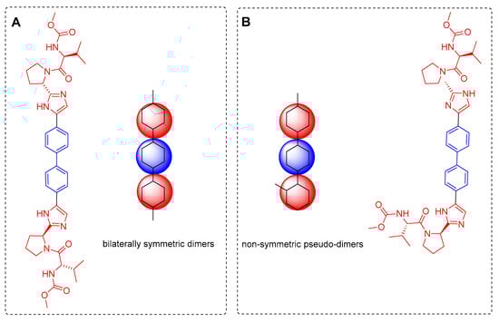 The design of new molecules with pharmacological potential nowadays involves multiple theoretical, computational, and experimental considerations. However, the role of molecular symmetry and its potential influence on biological target recognition have been comparatively underexplored. Bai and Wang identified some guidelines to classify dimer-type molecules with high symmetry from a synthetic perspective [1]. When two chemical fragments connected by a linker are identical and share the same mode of connectivity to that linker, the resulting structure is defined as a bilaterally symmetric molecule (Figure 1A). In such cases, global symmetry becomes evident, and the molecules commonly exhibit C2, Cₛ, or C2ᵥ symmetry elements. Conversely, when the fragments are chemically identical but differ in their connectivity to the linker, the molecules are classified as non-bilaterally symmetric pseudo-dimers (Figure 1B). A relevant example of a dimer with bilateral symmetry is the commercial drug Daclatasvir (Figure 1A), an antiviral used for the treatment of hepatitis C by inhibiting its NS5A protein [2].