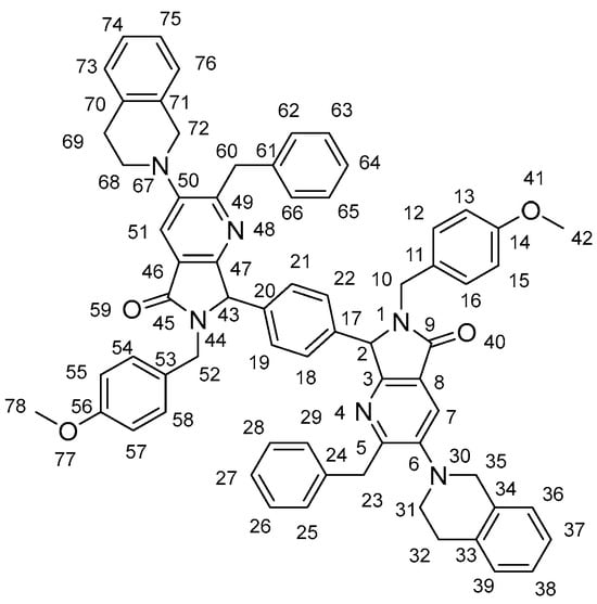 3.2. One Pot Synthesis and Characterization of 7,7′-(1,4-Phenylene)bis(2-benzyl-3-(3,4-dihydroisoquinolin-2(1H)-yl)-6-(4-methoxybenzyl)-6,7-dihydro-5H-pyrrolo[3,4-b]pyridin-5-one) 17