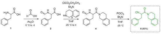 The target polyheterocycle 17 was synthesized through two multiple-bond-forming transformations. The first one involves a PR-UZ-5CR, which produces the bis-oxazole 13. In this reaction, terephthalaldehyde 6, acting as a bi-functional reagent, 4-methoxybenzylamine 7, and an α-isocyanoacetamide 5 functionalized with the tetrahydroisoquinoline scaffold were sequentially combined. Since the latter component is not commercially available, it was synthesized through a three-step sequence involving an initial formylation, an N-acylation, and a Ugi-type dehydration, following the methodology reported by Bienaymé (Scheme 1) [9].