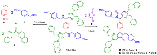 After establishing the optimal conditions for the pseudo-repetitive Ugi-Zhu five-component reaction (PR-UZ-5CR), the focus shifted to the post-transformation step to achieve the highly symmetric polyheterocycle 17. This transformation involved a double cascade sequence: intermolecular aza Diels-Alder cycloaddition/intramolecular N-acylation/aromatization, this latter one including a tandem decarboxylation-dehydration process. Thus, the bis-oxazole 13 reacted with maleic anhydride (8), serving as the dienophile. Remarkably, with constant stirring, the reaction reached completion within 15 min, resulting in a polyheterocyclic product 17 with a yield of 67%. Alternatively, the same compound 17 was synthesized in a one-pot process, yielding a comparable result of 63%, which is considered satisfactory, especially since it only required a straightforward work-up.