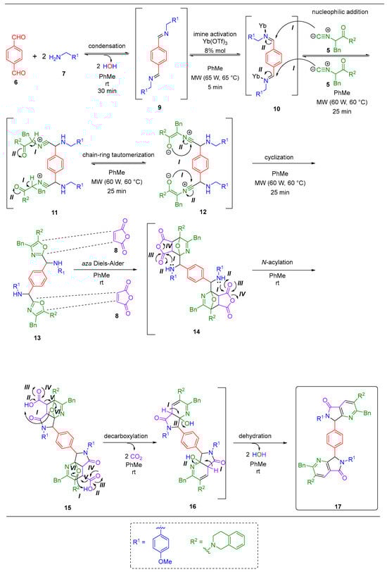 The proposed reaction mechanism leading to polyheterocycle 17 begins with the condensation of aldehyde 6 and benzylamine 7, resulting in the formation of bis-imine 9. This intermediate is then converted into the bis-iminium cation 10 through coordination with the ytterbium catalyst. This activation promotes the nucleophilic addition of the divalent carbon from α-isocyanoacetamide 5 to the electrophilic carbon of intermediate 10, which generates a bis-nitrilium cation 11. This one subsequently undergoes intramolecular tautomerization and cyclization to yield the bis-oxazole 13, which then reacts with maleic anhydride 8 via a double aza Diels–Alder cycloaddition, resulting in the formation of the oxa-bridged intermediate 14. This intermediate undergoes a rapid intramolecular acylation, followed by a tandem decarboxylation-dehydration step, which ultimately produces the polyheterocyclic bis-pyrrolo[3,4-b]pyridine-5-one 17 (Scheme 3).