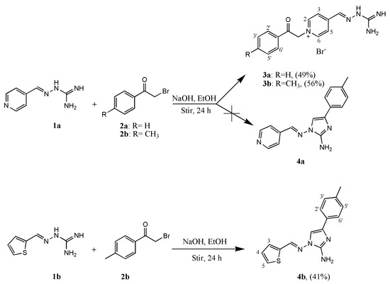 In the case of thiophene guanylhydrazone, 1b, cyclization occurred, yielding imidazole derivative 4b, confirmed by a characteristic singlet at δ 7.91 ppm (H-5 of imidazole) in its 1H-NMR spectrum [10,23].