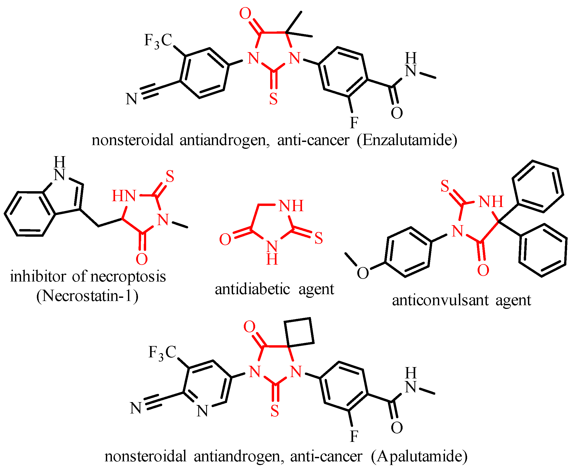 Structural modifications in 2-thioxo-4-imidazolidinone (2-thiohydantoin) produce compounds with a wide spectrum of pharmacological and biological activities, including antibacterial, antifungal, anticonvulsant, anti-human immunodeficiency virus (HIV), anticancer, antitumor, antidiabetic, and anti-inflammatory activities [1,2,3,4]. This scaffold is also included in the structures of medicinal products such as Enzalutamide and Apalutamide, which have been FDA-approved as nonsteroidal antiandrogens, or Necrostatin-1, an inhibitor of necroptosis [1,5,6] (Figure 1). Thus, the development of new synthetic approaches to compounds bearing a 2-thioxo-4-imidazolidinone core is in demand.