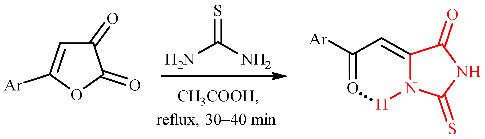 Earlier, the formation of 2-thioxoimidazolidin-4-ones was described by refluxing 5-arylfuran-2,3-diones with thiourea in 15 mL of anhydrous acetic acid for 30–40 min (Scheme 1) [7].