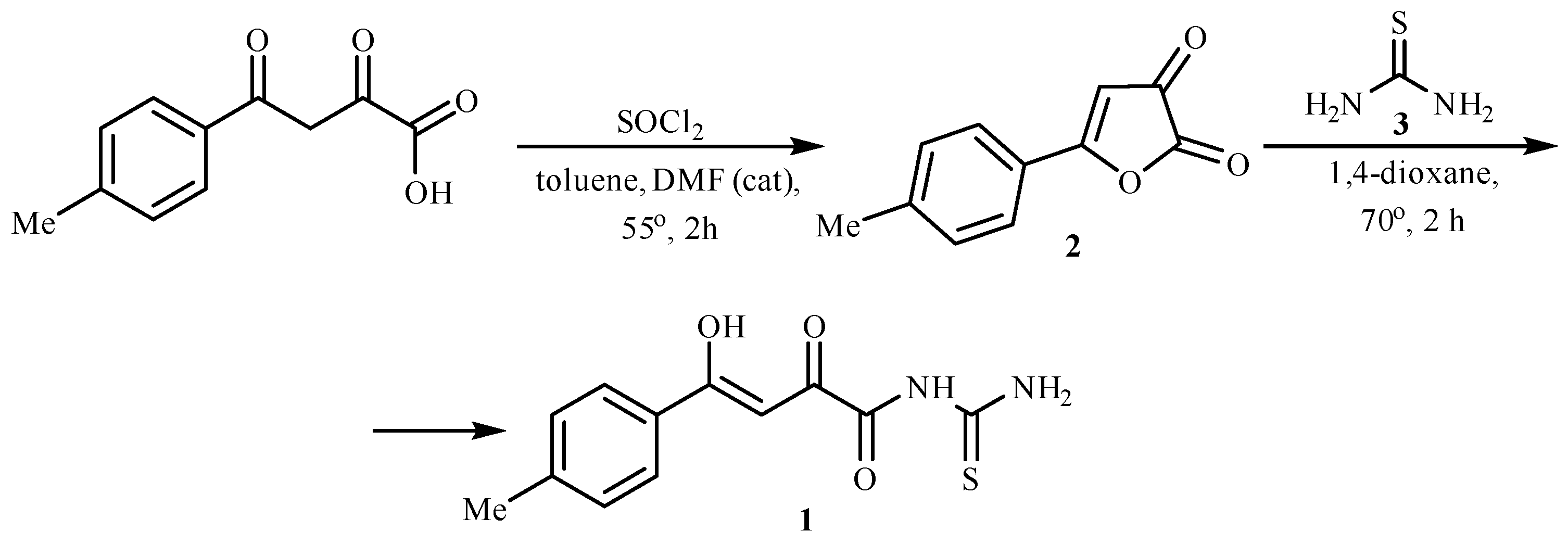 The title compound 1 was synthesized in several stages (Scheme 2). Initially, 5-(p-tolyl)furan-2,3-dione 2 was obtained in the reaction of 2,4-dioxo-4-(p-tolyl)butanoic acid with thionyl chloride [9]. Then, as a result of the reaction of compound 2 and thiourea 3, (Z)-N-carbamothioyl-4-hydroxy-2-oxo-4-(p-tolyl)but-3-enamide 1, the target compound, was obtained for the first time.