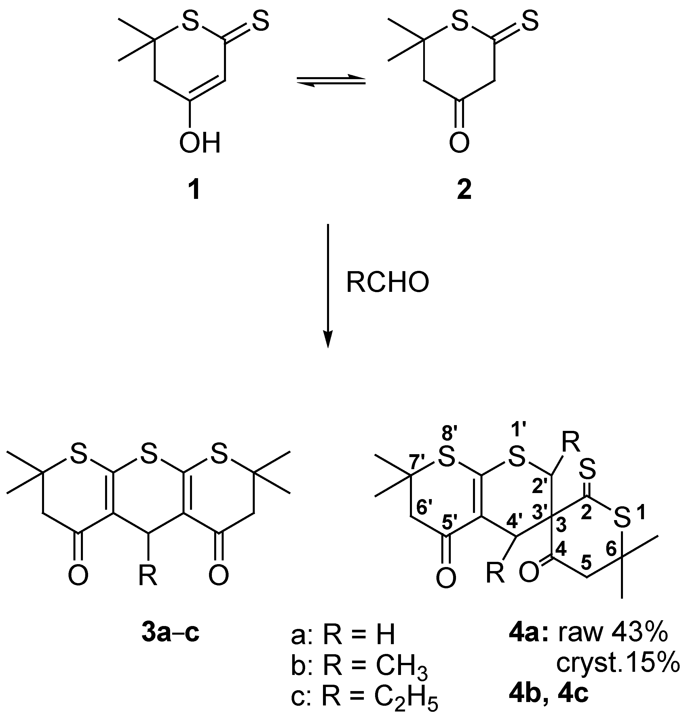 - Schweiger, K.; Wendelin, W.; Kratky, C. Reaction of the Tautomers 4-Hydroxy-2H-thiopyrane-2-thione and 2-Mercapto-4H-thiopyrane-4-one with Aliphatic Aldehydes. Chem. Mon. 1983, 114, 1359–1370. [Google Scholar] [CrossRef]
