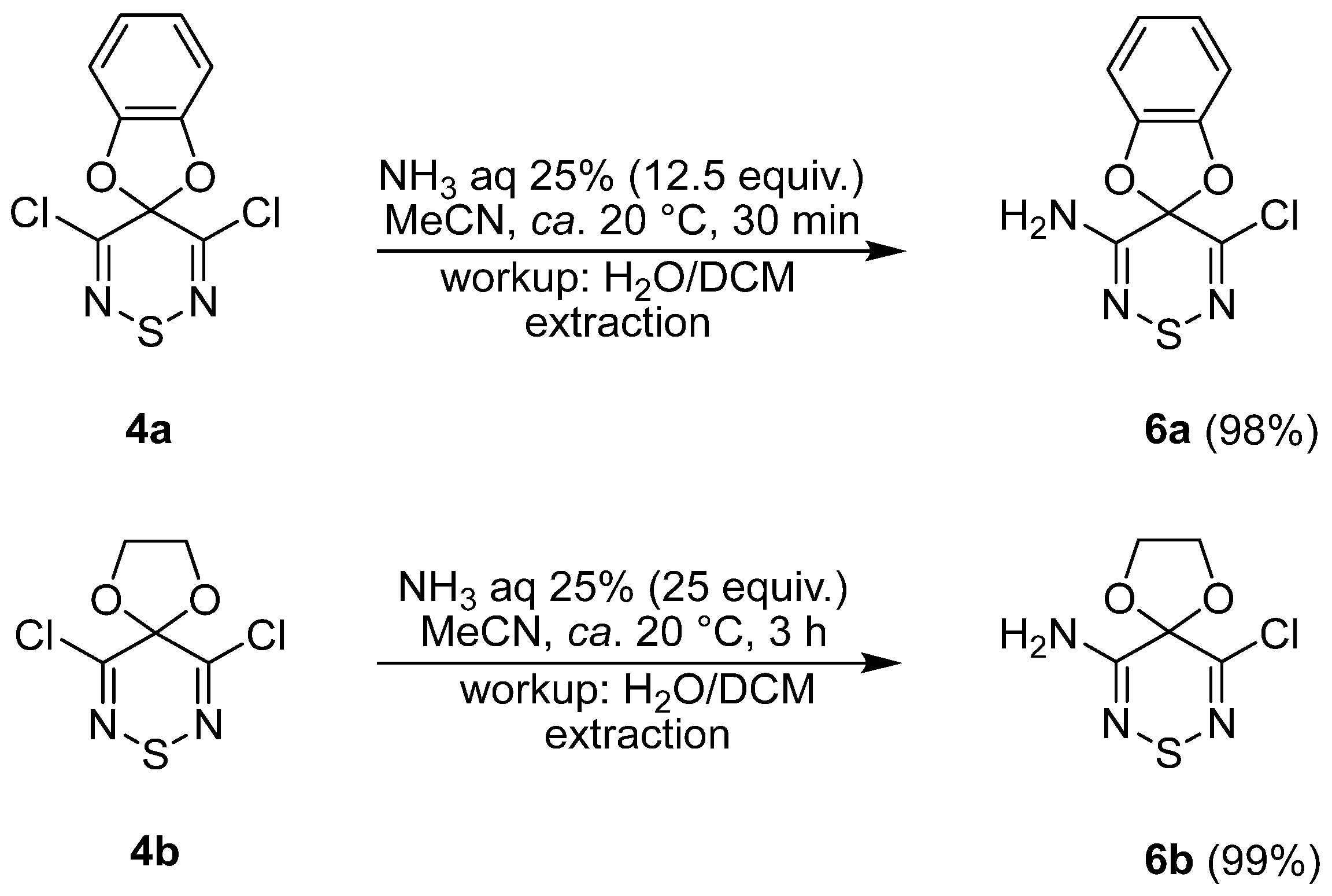 - Kalogirou, A.S.; Koutentis, P.A. Regioselective geminal dichloride reactivity of 3,4,4,5-tetrachloro-4H-1,2,6-thiadiazine: Access to 4,4-dioxo- and dithio-ketals. Tetrahedron Lett. 2016, 57, 203–205. [Google Scholar] [CrossRef]