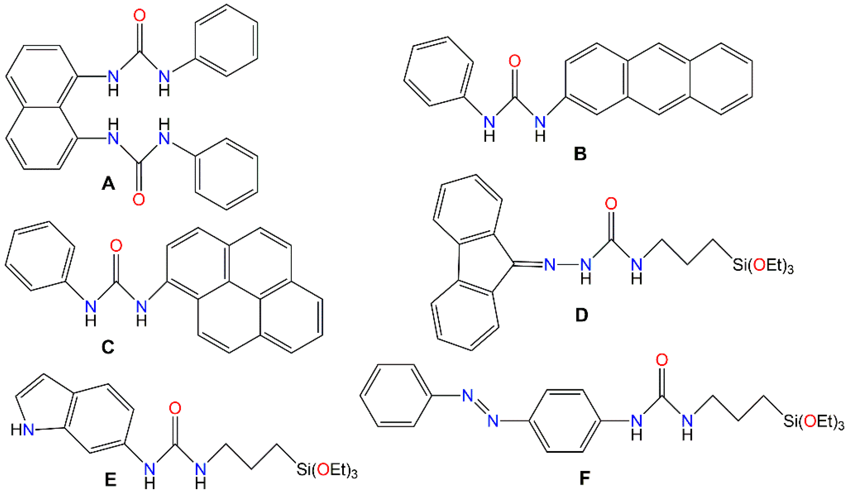 - Singha, G.; Saroa, A.; Rani, S.; Girdhar, S.; Sahoo, S.; Choquesillo-Lazarte, D. Substituted phenyl urea and thiourea silatranes: Synthesis, characterization and anion recognition properties by photophysical and theoretical studies. Polyhedron 2016, 112, 51–60. [Google Scholar] [CrossRef]