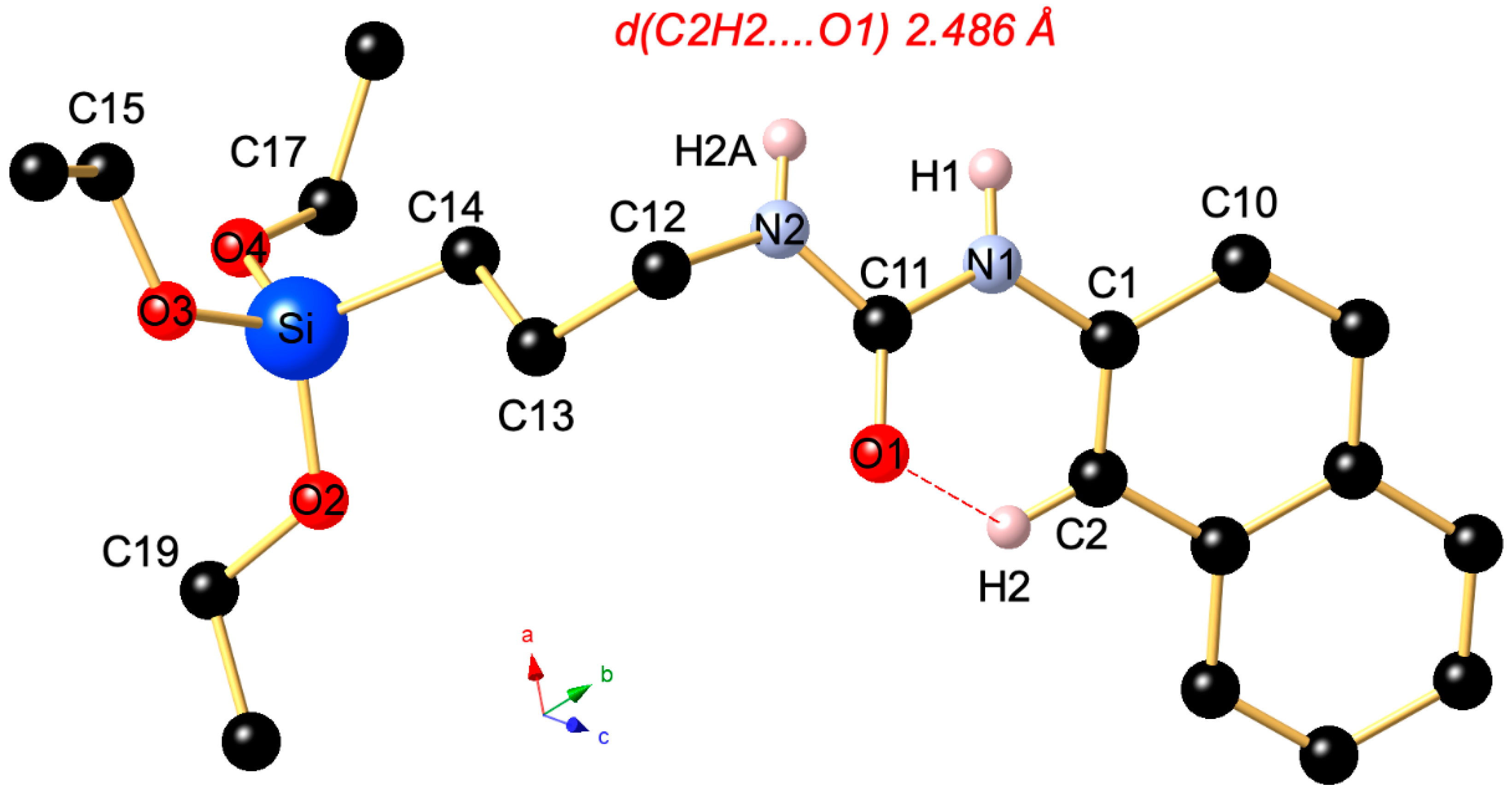 APA StyleKhatyr, A., Jourdain, I., Knorr, M., Strohmann, C., & Schrimpf, T. (2026). Synthesis of 1-(Naphthalen-2-yl)-3-(3-(triethoxysilyl)propyl)urea and Determination of Its Crystal Structure. Molbank, 2026(1), M2129. https://doi.org/10.3390/M2129