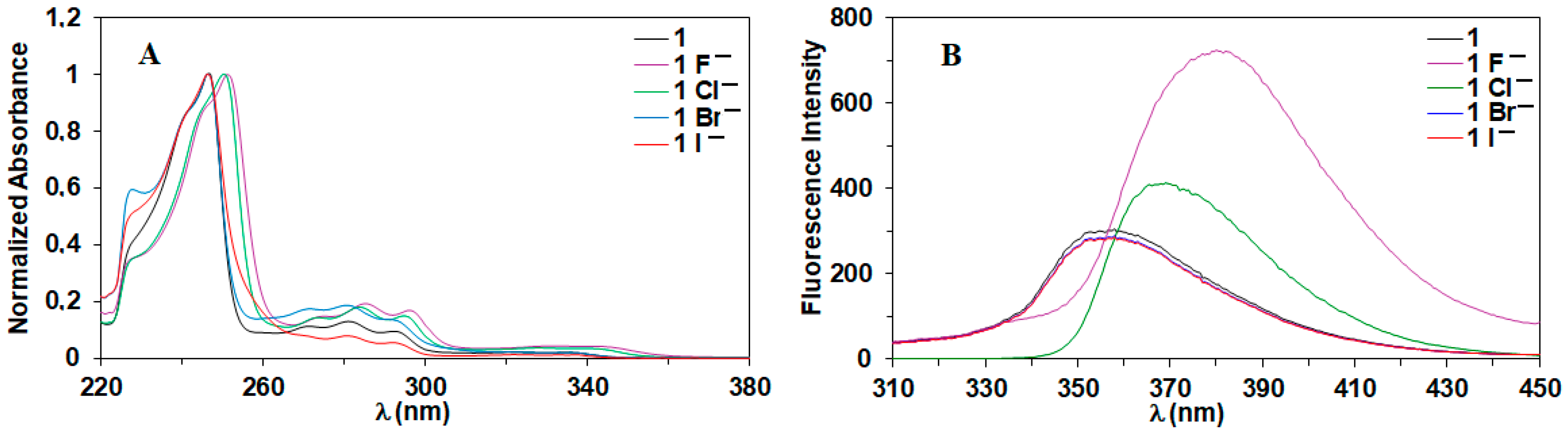 2.3. Investigation of Halide Detection by UV–Vis Absorption and Emission Spectroscopy