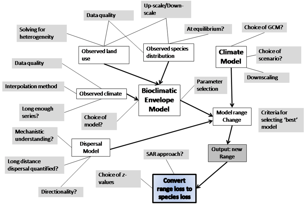 Some of the steps, choices and assumptions involved in modelling species losses resulting from future climate change using the species distribution modelling approach. Not all studies involve all elements, e.g., land-use data, or dispersal models, but these components are important for increased realism (re-drawn from []).