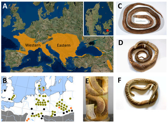 The Aesculapian snake is a non-venomous colubrid snake distributed in Central and Southern Europe including the Balkans, Anatolia, and Iran, with introduced populations in Wales and London (Figure 1). The species’ northern distribution limit coincides with the 48th to 50th parallel north, but c. 10 isolated populations in Germany, Czech Republic, and Poland exist outside the main distribution, restricted to warm and humid microhabitats in river valleys [3,4,5]. A further five northern populations have gone extinct during the last 150 years [6], including the population in Denmark. These isolated populations, whether extinct or extant, are possible remnants of an earlier, more widespread distribution, evidenced by numerous fossil findings of this species [7,8] (Figure 1). In the mid-Holocene, the mean temperature in the northern hemisphere was higher than the present day which is why some thermophilous European species, including Z. longissimus, had a distribution extending further north than their current distribution [9,10]. Aesculapian snake fossils from Denmark represent the species’ Mid-Holocene northernmost distribution border [9,11,12]. The presence of this species during historical times in Denmark is evidenced by a number of direct observations and museum specimens collected throughout the 17th to 19th centuries [13,14,15]. All reliable observations of living Aesculapian snakes in Denmark derive from the southern tip of the island Zealand (Sjælland) [16,17] (Figure 1). This area was earlier characterized by coppice of hazel [18], but the management practice ceased in late 1800s and the habitat changed, likely becoming unfavourable for the snakes. Three ethanol-preserved specimens exist from the historical Danish population from Southern Zealand, collected in 1810, 1851, and 1863, respectively, but no previously-published study on Z. longissimus morphology or phylogenetics has included these specimens.