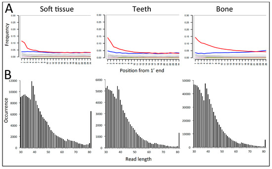 DNA damage based on shotgun sequencing data of three types of tissue (soft tissue, tooth, bone) obtained from the same historical Z. longissimus individual (ZMUC R8974), and using T. sirtalis as reference genome in the mapping. A: C to T deamination damage (red line) recorded at each position in the read from the 5′ end of the molecules (output from mapDamage). B: The mapped read length distribution showing very short average read lengths and an exponentially declining distribution as typical for degraded DNA [31]. The peaks at ca. 38 and 64 bp represent bioinformatic mapping artefacts. In BWA the number of allowed mismatches when aligning each sequence to the reference genome is defined by the sequence length, increasing from 2 to 3 allowed mismatches at 38 bp, and 4 allowed mismatches at 64 bp. This relax in stringency is observed as more reads mapping. The peak observed at 81 bp represents the tail of the distribution piling up at the maximum sequencing length applied in this run.
