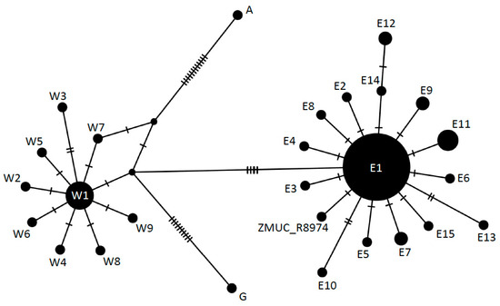 - Leigh, J.W.; Bryant, D. Popart: Full-feature software for haplotype network construction. Methods Ecol. Evol. 2015, 6, 1110–1116. [Google Scholar] [CrossRef]