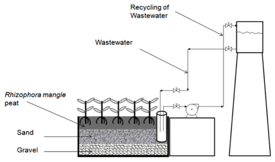 Gersberg et al. [7] compared artificially the nutrient removal efficiency of the cattail (Typha sp.)—a common wetland plant—and the reed perennial grass (Phragmites sp.) using sand beds filled with domestic residual water. He reported a high removal rate of nitrogen compounds from freshwater in both cases, but Typha sp. was the most efficient converter, as it showed a higher biomass production of roots. Martínez-Cruz et al. [8] made artificial wetland habitats with Scirpus americanus (enrooted macrophytes) and Lemna gibba—an aquatic floating plant. In both cases, they obtained significant differences in nutrient removal rates compared with their controls. Habitats with S. americanus removed a total of 89%, 86% and 38% of nitrites, ammonia nitrogen and reactive phosphorous from water, respectively, whereas bed filters of L. gibba removed 90%, 80%, and 50%, respectively. Consequently, Huang et al. [9] stated that mangrove forests could be considered a tolerant group of plants for wastewater effluents due to their enormous nutrient demand. Apart from nutrient removal, Bayen [10] considers that mangroves play a key role in removing and/or degrading pollutants, such as heavy metals and pesticides from estuaries and coastal lagoons.