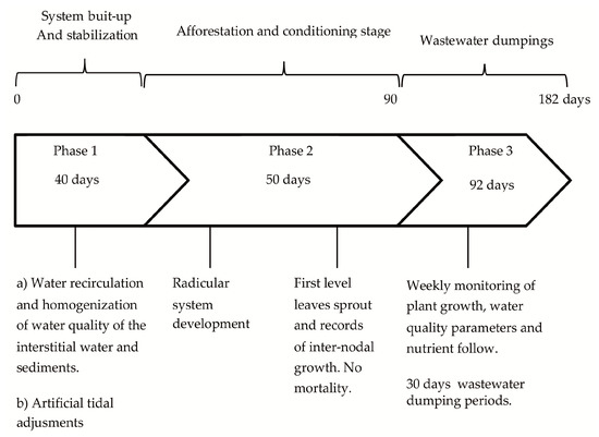Temperature was fixed at 26 ± 3 °C, with two air conditioners systems of 12,000 BTU each (English power units) and ventilators. Light incidence was ~50% reduced with a shadow mesh fixed at certain height that allowed air circulation avoiding the built-up of high temperatures inside the facilities. Filters in each tank were built from top to bottom with 0.11 m3 of mangrove peat, 0.08 m3 of sand and 0.08 m3 of gravel. The mangrove peat was composed of 42% sand, 55% lime and 3% clay, which correspond to the soil texture category of silt loam, with sand grains and low content of clay. Other conditions, such as topography (ground leveling), frequency of flooding, as well as interstitial water salinity (26 ± 3 PSU) and redox potential (−195.9 ± 84 mV, oxygenic environment) were set to emulate the plant collection site, following historical records of Agraz-Hernández et al. [22]. Salinity adjustments were performed following the criteria of Orozco [23]. During a 40 d period, water parameters were monitored and afforestation was performed, ensuring that conditions were similar to the natural environment (Figure 2).