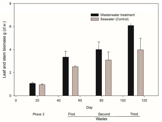 Significant differences were detected in biomass production between treated and untreated seedlings (p < 0.10). Plants exposed to wastewater spills displayed a biomass increment up to 45% between the first and third dumping (Figure 5), while the biomass increment for the same period of the control groups was about 37%.