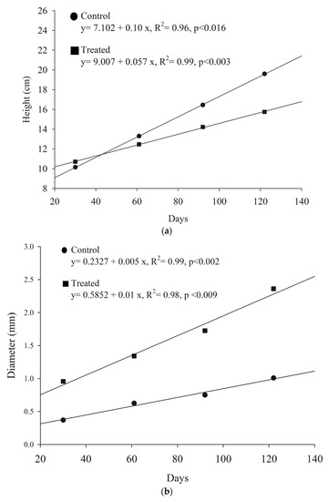 Single linear regression analysis defined the growth in height of treated and control plants with high concordance (R2 = 0.99, p = 0.003 and R2 = 0.96, p = 0.016, Figure 4a).