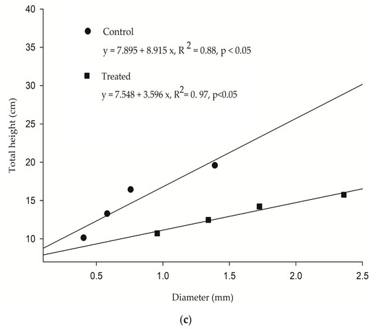 (a) Relationship between height and the time in treated plants and control; (b) Relationship between diameter and the time in treated plants and control; (c) Allometric relationship between height and diameter in treated plants and control.