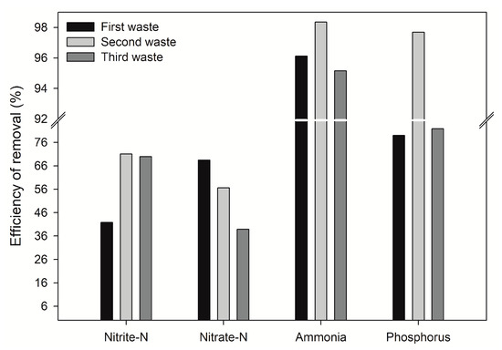 where %R = nutrient removal efficiency; CE = inlet concentration of the effluent; and CS = outlet concentration of the effluent. Individual nutrient removal efficiency was also calculated by the former method.