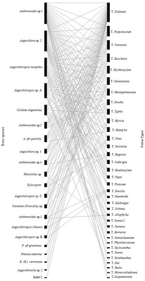 Concerning the plants, out of the 35 pollen types found, only three interacted with 10 or more bee species, and Solanum was the pollen type that had the highest number of interactions with the different bee species, and therefore a more general type. Nine pollen types (T. Ilex, T. Butia, T. Stenachaerum, T. Jaquemontia, T. Stylosanthes, T. Senna, T. Struthanthus, Pytolacaceae, and T. Monocotyledon) had interactions with only one bee species, and therefore was more specialized.