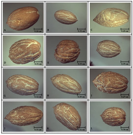 Endocarp images captured using a stereoscope Leica Wild. (A) “Zambu 17”; (B) “Zambu 01”; (C) “Galega 01”; (D) “Maca Al”; (E) “Maca 16”; (F) “Gama 32”; (G) “Cordo 01”; (H) “Verde 01”; (I) “Verde 15”; (J) “Bico 04”; (K) “Carra 01”; (L) “Maca 12”.