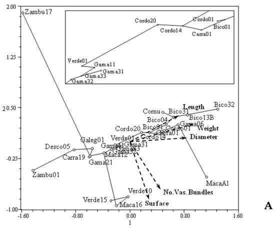 The endocarp images and characteristics for the different accessions are shown in Figure 2 and Supplementary Table S1. We found that the surface roughness and the number of vascular bundles over the endocarp surface were characteristics with little variation in keeping with observations from the Spanish Extremadura region [] as well as from the Italian Tuscany region []. However, our data revealed important differences and variability in other endocarp characteristics. The PCA analysis of the data allowed for the discrimination of the olive trees, with the first two principal components explaining 77.27% of the total variation (48.37% and 28.90% for the first (I) and the second (II) principal components, respectively). The I principal component is controlled by weight, length and diameter of the endocarps and the II principal component by the number and distribution of vascular bundles on the endocarp surface (Figure 3). According to the projections of the 27 accessions onto the plane defined by the I and the II principal components, the endocarps with higher diameter are on the right (e.g., “Bico 32” and “Maçanilha Algarvia–Maca Al”), and those with low diameter are on the left (e.g., “Zambujeiro 01–Zambu 01” and “Galega–Galeg 01”). On the other hand, on the upper side of the plane are endocarps with a lower number of vascular bundles (e.g., “Zambujeiro 17–Zambu 17”) and on the lower side are endocarps with higher surface roughness (e.g., “Maçanilha 16–Maca 16” and “Maçanilha Algarvia–Maca Al”) (Figure 3A and Supplementary Table S1). The oleasters (“Zambu 01” and “Zambu 17”), which have a typical wild aspect, are quite distant from all the other accessions, although quite distinct from each other. It was not possible to conclude if they are true oleasters or feral forms. The unnamed tree (“Desco 05”) is close to the traditional cultivar “Galega–Galeg 01” (Figure 3) and could have resulted from hybridization with a wild olive tree (Figure 3A). The “Maçanilha Algarvia–Maca Al” which is not grown in Ficalho, is in Figure 3A far from the local varieties. Considering the remaining traditional local varieties, it is observed that the majority are in the center of the plane defined by the I and the II principal components. Two “Verdeal Alentejana” trees (“Verde 10” and “Verde 15”) are distant from the central group due to the surface roughness (Supplementary Table S1). “Bico de Corvo 32” (“Bico 32”) is also different from all the other “Bico de Corvo” trees due to its heavier weight and longer diameter.