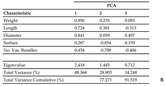 Plant characterization is usually carried out using a large number of descriptors. In olives, descriptors based on endocarp characteristics can help determine the identity of a cultivar [,]. Forty fruits from each tree were collected during two seasons (2012 and 2013). Five endocarp characteristics were evaluated as follows: weight (g), length (mm), diameter (mm), and number and distribution of vascular bundles, using established methodologies []. Endocarp images were captured using a stereoscopic microscope Leica Wild MZ8 equipped with a Leica DC200 camera linked to a Leica IM50 image management software.