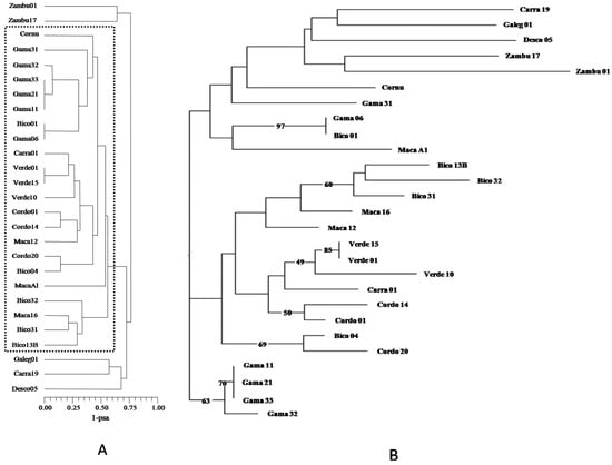 UPGMA (A) and Neighbor-Joining tree (B) of the 27 Olea europaea trees. All the cultivated olive trees are inside the dotted area (A). The tree construction was inferred from the bootstrapped dissimilarities, and a bootstrap value was given to each edge that indicates the occurrence frequency of this edge in the bootstrapped trees. Bootstrap values greater than 50 are indicated (B).