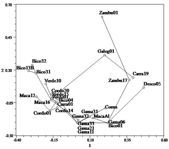 The PCoA results are similar to those obtained by the UPGMA and the Neighbor-Joining algorithm. The wild trees (“Zambu 01” and “Zambu 17”), the unnamed tree (“Desco 05”) and the cultivars not grown in Ficalho (“Maçanilha Algarvia–Maca Al” and “Cornezuelo–Cornu”) are outliers. The local cultivars are distributed in three groups. “Bico de Corvo” (“Bico 13B”, “Bico 31” and “Bico 32”) and “Gama” (“Gama 11”, “Gama 21”, “Gama 32” and “Gama 33”) constitute two separate groups. The remaining local varieties are clustered in the third group (Figure 5).