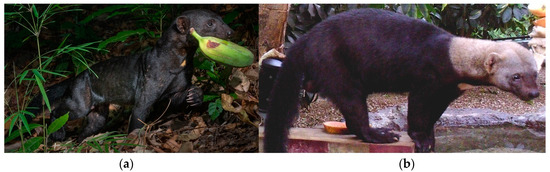 The tayra (Eira barbara) is a neotropical scansorial (with terrestrial and arboreal habits) mustelid with a distribution that extends from the coasts of Central Mexico to northern Argentina (Figure A1). This species has variable coat color across its distribution that ranges from uniform (Figure 1a) to disruptive (Figure 1b). Seven subspecies based on coat coloration variation have been recognized throughout its range; three for Mexico to Panama, and the rest for South America (Table 1; [14,15,16]). Recent research based on analysis of mitochondrial DNA has reduced the number of subspecies in South America from five to two [17]. The exact number of subspecies remains questionable with their current geographical distribution and the status of their populations unknown.