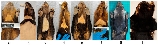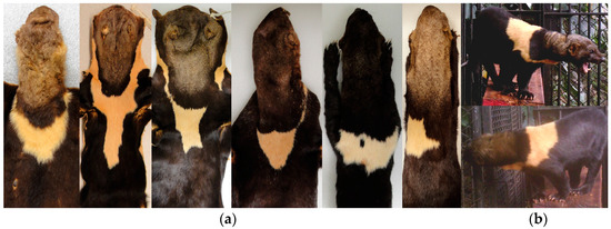 There are examples in the literature of individual identification of wild mustelids (Carnivora: Mustelidae). Trujillo et al. [11] described individuals of the giant otter (Pteronura brasiliensis) with a uniquely patterned white-yellow chest patch. Magoun et al. [12] identified individuals of wolverine (Gulo gulo) through the observation of the unique light-colored patterns on the chest, throat, and chin area. Sirén et al. [13] recognized and contrasted individuals of American marten (Martes americana) through the analysis of the ventral patch on the chest and throat. Harrison [10] analyzed the pattern of the dorsal head stripes of the American badger (Taxidea taxus), identified individuals in the wild, and subsequently verified the difference of these characters among preserved individuals in a zoological collection.