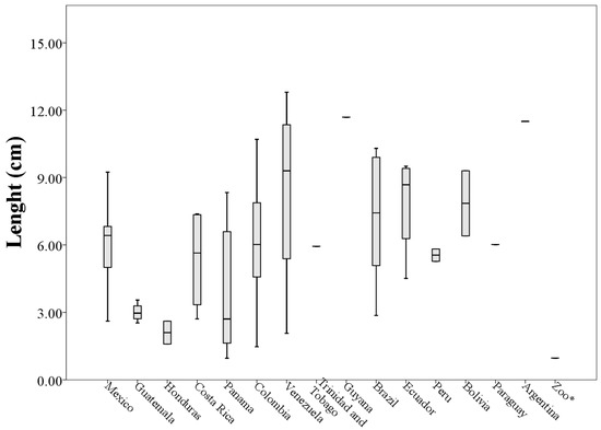 Variation of the length measures (cm) of the throats patches from 73 analyzed museum specimens of Eira barbara. * = Specimen of unknown geographical origin.