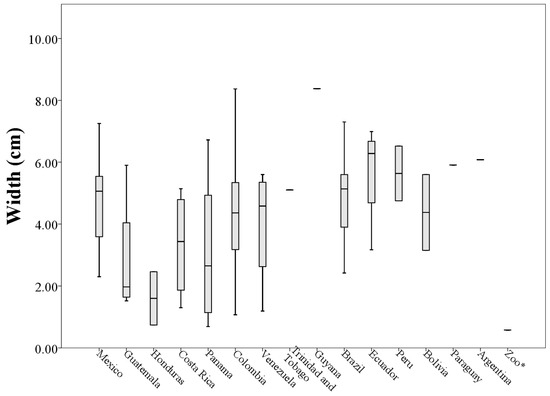 Variation of the width (cm) of the throats patches from 73 analyzed museum specimens of Eira barbara. * = Specimen of unknown geographical origin.