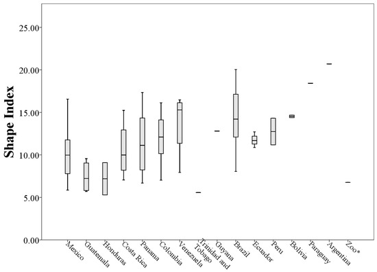 Variation of the shape index values of the throats patches from 73 analyzed museum specimens of Eira barbara. * = Specimen of unknown geographical origin.