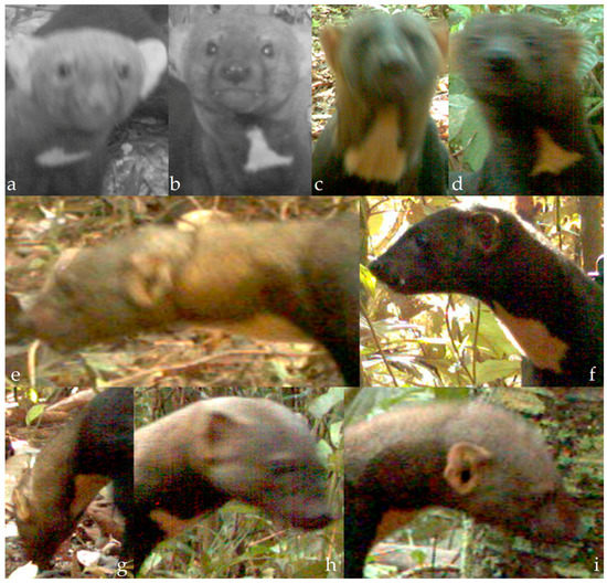 Comparison of the throat patch of the nine (a–i) uniquely identifiable individuals. Note that both the frontal (a–d) and lateral images (e–i) can be used to differentiate among individuals. Note: The pictures were taken with camera traps during 2008, producing low resolution photographs. Some tayras were photographed in motion, for that reason some photographs are not in focus.