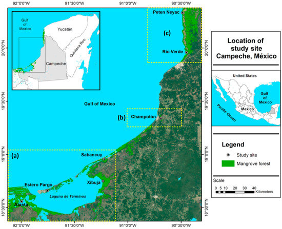 Map of the seven study mangrove forests bordering the coast of Campeche, México. (a) Laguna de Terminos, (b) Rio Champoton, and (c) Los Petenes Biosphere Reserve.