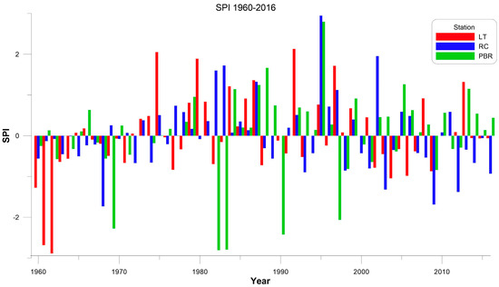 Along the coast of Campeche, the precipitation was heterogeneous between 1960 and 2016 (Figure 2). Severe droughts were registered from 1960 to 1970, 1981, 1982, 1990, and 1998. However, the most intense drought occurred from 1960 to 1965 in LT and in 1982 for PBR. In contrast, the precipitation surpassed the reference average in 1975, 1980, 1992, and 1997 (Figure 2). From 1960 to 1999, the extreme drought presented every six years, while for the period from 2000 to 2016, droughts were more frequent, between 3 to 4 years apart, but were classified as severe to moderate droughts.