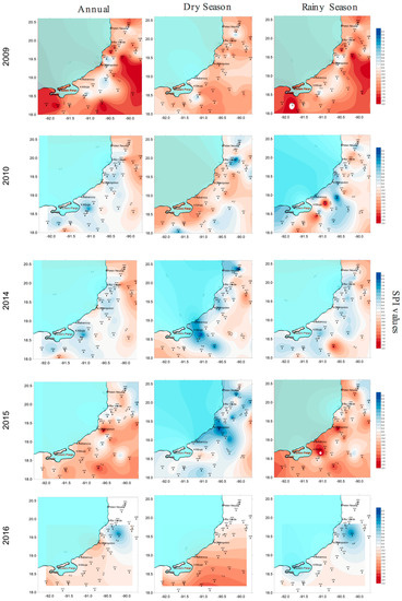 The standardized precipitation index (SPI) assessed the deficit or excess of precipitation in 2009, 2010, 2014, 2015, and 2016 based on the criteria provided by Mckee et al. [31] (Table 1). The SPI evaluates the deficit or excess precipitation for a site during a given period, from one month up to four years [32,33]. SPI values most commonly fall in the range of −2 to +2. The values correspond to different categories of drought [24]. To calculate the SPI, we used the Climate Computing Project (CLICOM) of the Comision Nacional del Agua (CONAGUA) [34]. This database collected the daily precipitation accumulated data from 48 stations (meteorological number stations 4001–4088) in the state, for the period of 1920 to 2016. The SPI was calculated based on the analysis of both annual and seasonal (dry season is February–April and the rainy season is May–October) data [18].