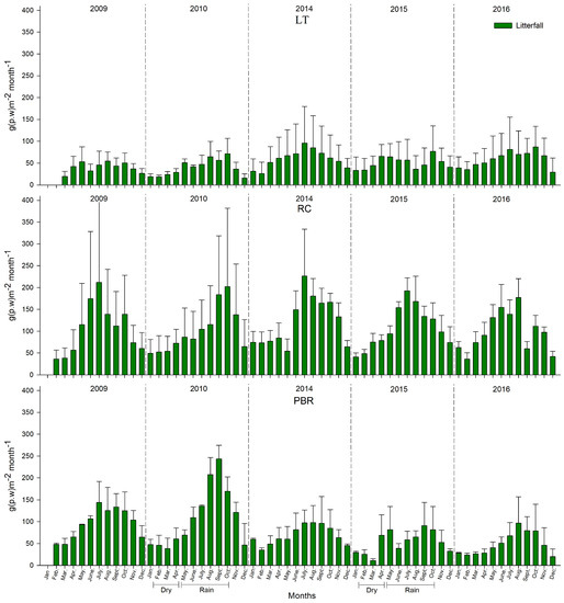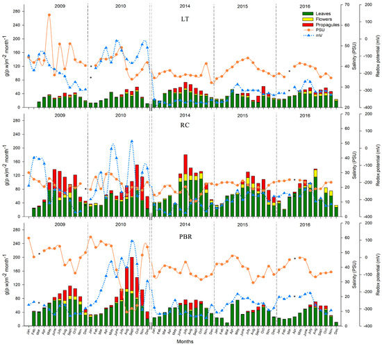 Leaf and propagule production were significantly different among years and seasons (p < 0.001), while flower production was only significantly different among seasons (p < 0.001) (Figure 5). Interactions between years and seasons were significant for leaf (p < 0.001), propagule (p < 0.001), and flower (p < 0.05) production (Figure 5). During the rainy season, leaf, propagule, and flower production in all three areas were higher than during the dry season (Figure 5). Notably, PBR showed the highest production in 2010, while RC did so during 2014. Production was similar each year for LT. From 2014 to 2016 in PBR, 39%, 83%, and 63% lower production of leaves, flowers, and propagules, respectively, were recorded (Figure 5). For the same period, RC registered only a 25% lower production.