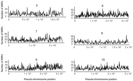 To visualize the distribution of SNPs in the tef genome, reads were mapped to each of the 10 individual tef pseudo-chromosome assemblies [7] using the BWA. After mapping, 10 separate VCF files per pseudo-chromosome were generated. These VCF files were processed with custom scripts and R (https://www.R-project.org/). The pseudo-chromosomes were divided into equal-size chunks using the R software packages plyr and dplyr. Using the ggplot2 function [36], the SNPs were plotted against their respective physical positions on each of the 10 pseudo-chromosomes.