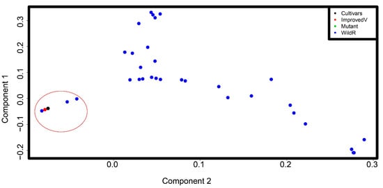 The population structure of the panel was determined using 3 clustering approaches. First, principal component analysis (PCA) was performed. The SNP dataset in VCF format was converted into the genomic data structure (GDS) data storage format using two high-performance computing R/Bioconductor packages, gdsfmt and SNPRelate [37]. Next, the dataset was LD-pruned as recommended in the SNPRelate package so that only SNPs that were in approximate linkage equilibrium with each other were used, to avoid the strong influence of SNP clusters in principal component and relatedness analysis. The LD-pruned SNP data was then used to calculate the genetic covariance matrix from the genotypes, compute the correlation coefficients, and calculate SNP eigenvectors. The names of individual germplasms and the population codes (cultivars, improved variety, mutant, and wild species) were used as input together with the GDS file. Then, the first 2 and 4 principal components were plotted.