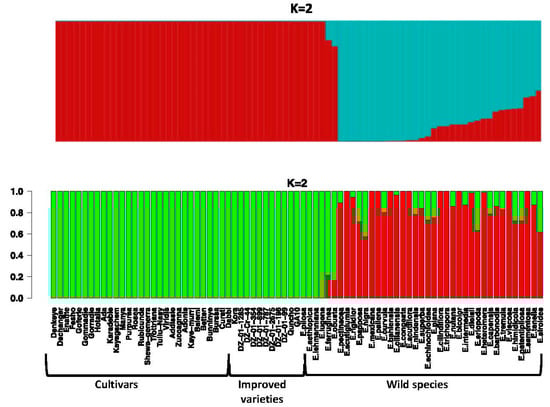 To perform population structure analysis, we used the ADMIXTURE program, which estimates the structure of ancestral populations, and the fastStructure program. Both programs identified a similar structure in the panel that matched the results of the PCA, with the most likely assignment occurring at K = 2, meaning two ancestral populations. Each ancestral population is shown in a different color within each plot (Figure 3 for K = 2 and Figure S4 for other values of K). Our analysis did not detect population structure among the tef subpopulations. The first distinct subgroup in the first half of the structure plot is composed of all the tef cultivars, improved tef varieties, and the mutant line; the other half of the plot consists of the wild Eragrostis species. Our analysis indicated both long and short stretches of mixed ancestry for some of the wild Eragrostis species, while the genomic composition of the tef cultivars appears to be homogeneous. This suggests that at K = 2, the germplasm panel shows structure that summarizes the germplasm class information (Table S1).