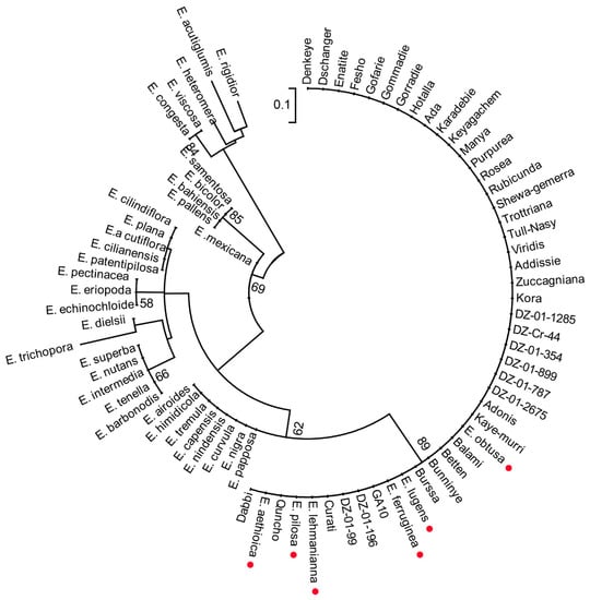 Maximum likelihood phylogenetic tree for species of the genus Eragrostis. The evolutionary history was inferred by using the maximum likelihood method based on the Tamura-Nei model in molecular evolutionary genetics analysis using maximum likelihood, evolutionary distance, and maximum parsimony methods (MEGA). The tree with the highest log likelihood is shown. Bootstrap values are shown above the branches. The tree is drawn to scale, with branch lengths measured in the number of substitutions per site. The analysis involved 79 nucleotide sequences. Codon positions included were 1st+2nd+3rd+Noncoding. All positions containing gaps and missing data were eliminated. The six wild Eragrostis species within the tef clade are noted by a red point.