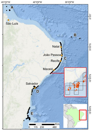 The study area and the reef cells (n = 2276), each one a squared-grid of 1 km2 containing coral reef habitat. Top inset is a zoomed view of reef cells containing coral reef habitat (depicted as orange patches). Coral reefs in Brazil occur in five geographically distinct sectors: (A) Parcel Manuel Luis; (B) Fernando de Noronha and Atoll das Rocas; (C) Northeastern coast; (D) Todos os Santos Bay; and (E) Abrolhos Bank.