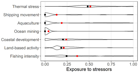 Exposure of Brazilian reefs to individual stressors. Violin plots depict the variation in levels of reef cell exposure to each stressor from low (i.e., 0) to high (i.e., 1). Red dots represent the mean level of exposure while black dots represent the median.